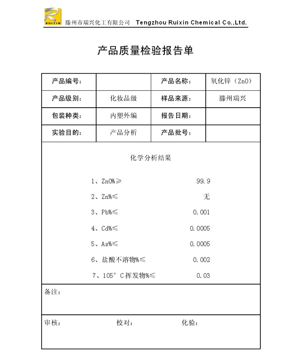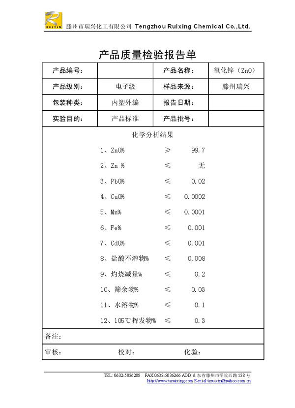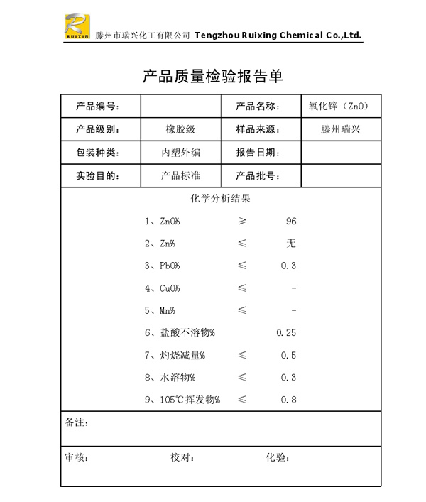 瑞興化工有限公司是生產(chǎn)氧化鋅的重點企業(yè),于2008年通過ISO9001:2008質(zhì)量管理體系認(rèn)證。“瑞興”牌氧化鋅在國內(nèi)擁有較大穩(wěn)定的市場,并遠(yuǎn)銷東南亞、中東、中南美等國家和地區(qū),在國內(nèi)外享有較高聲譽。
